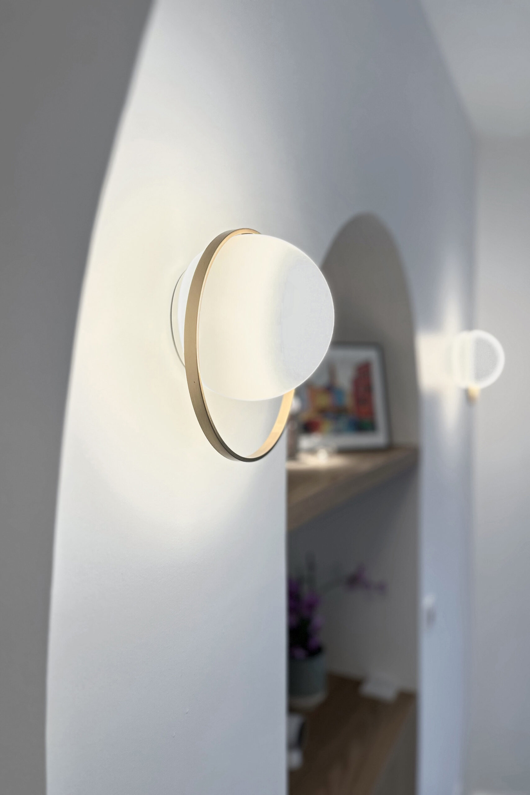 Face au lit, une niche rétroéclairée met en valeur une œuvre ronde en laque bleue évoquant la lune — un détail poétique qui personnalise l’espace.