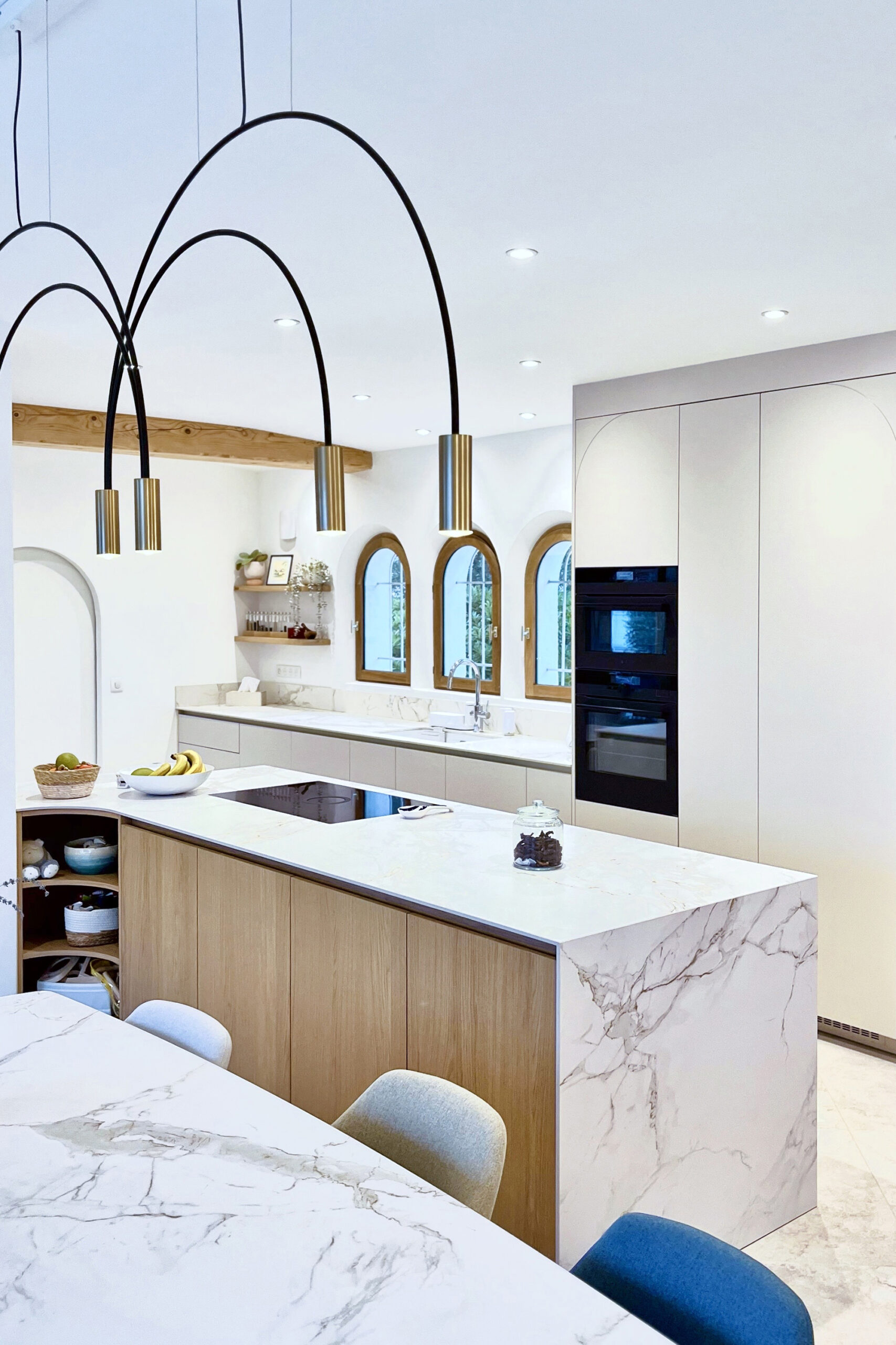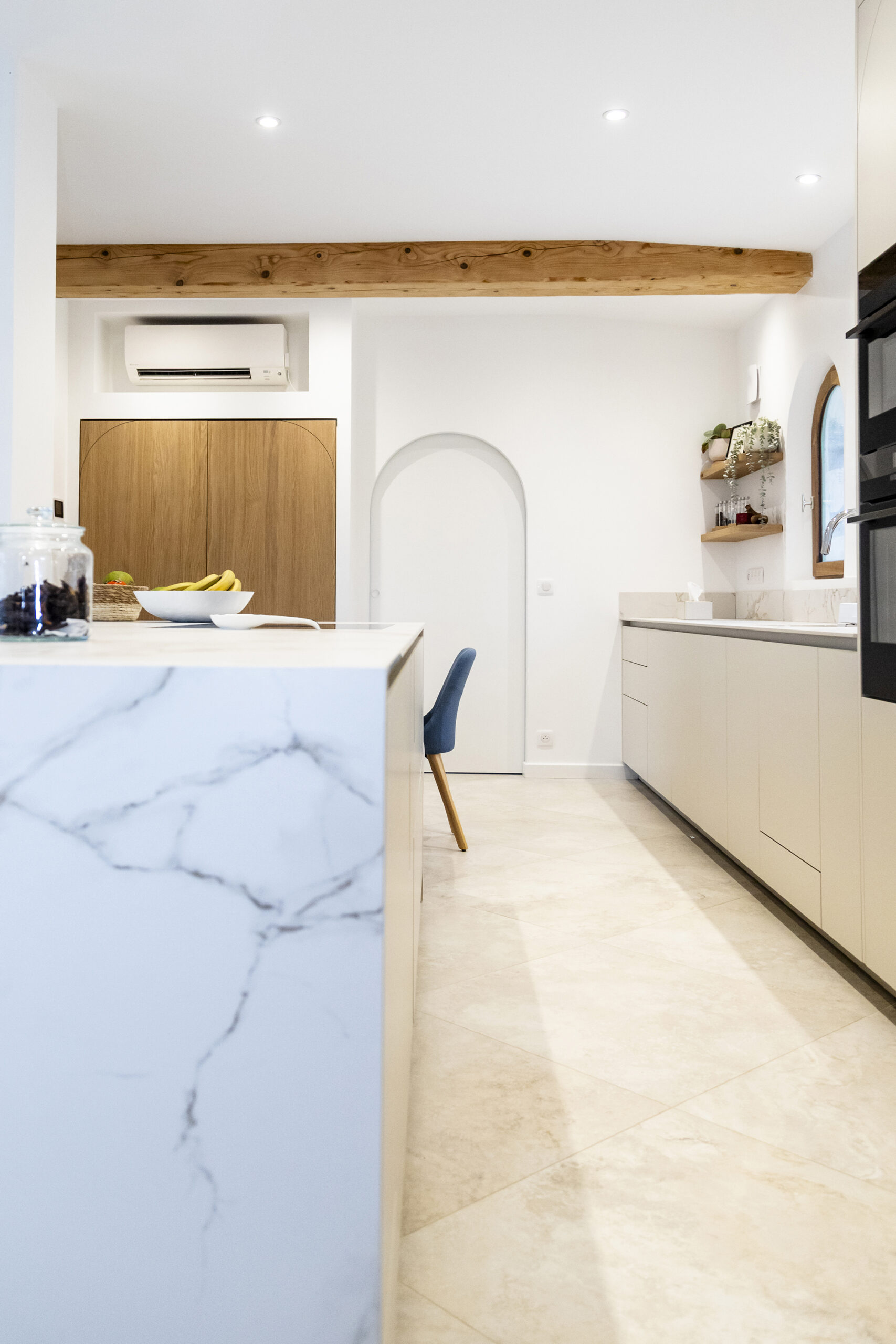 Entièrement pensée par LMAID, la cuisine se distingue par une organisation fonctionnelle et élégante, intégrant de nombreux rangements ainsi qu’un espace dédié aux repas du quotidien. Celui-ci comprend un meuble équipé de portes escamotables latérales plaquées chêne, une petite table et une banquette, toutes deux réalisées sur mesure.