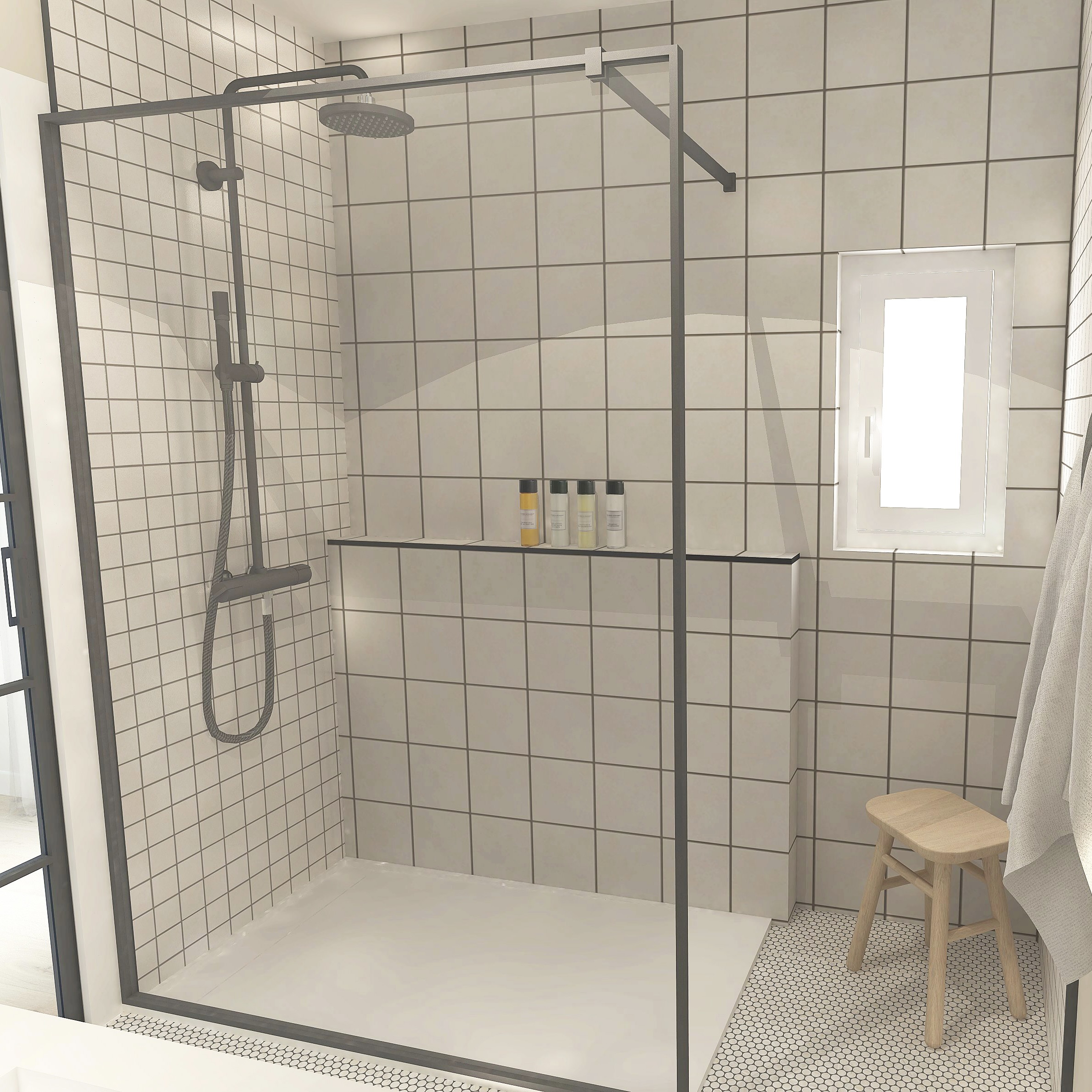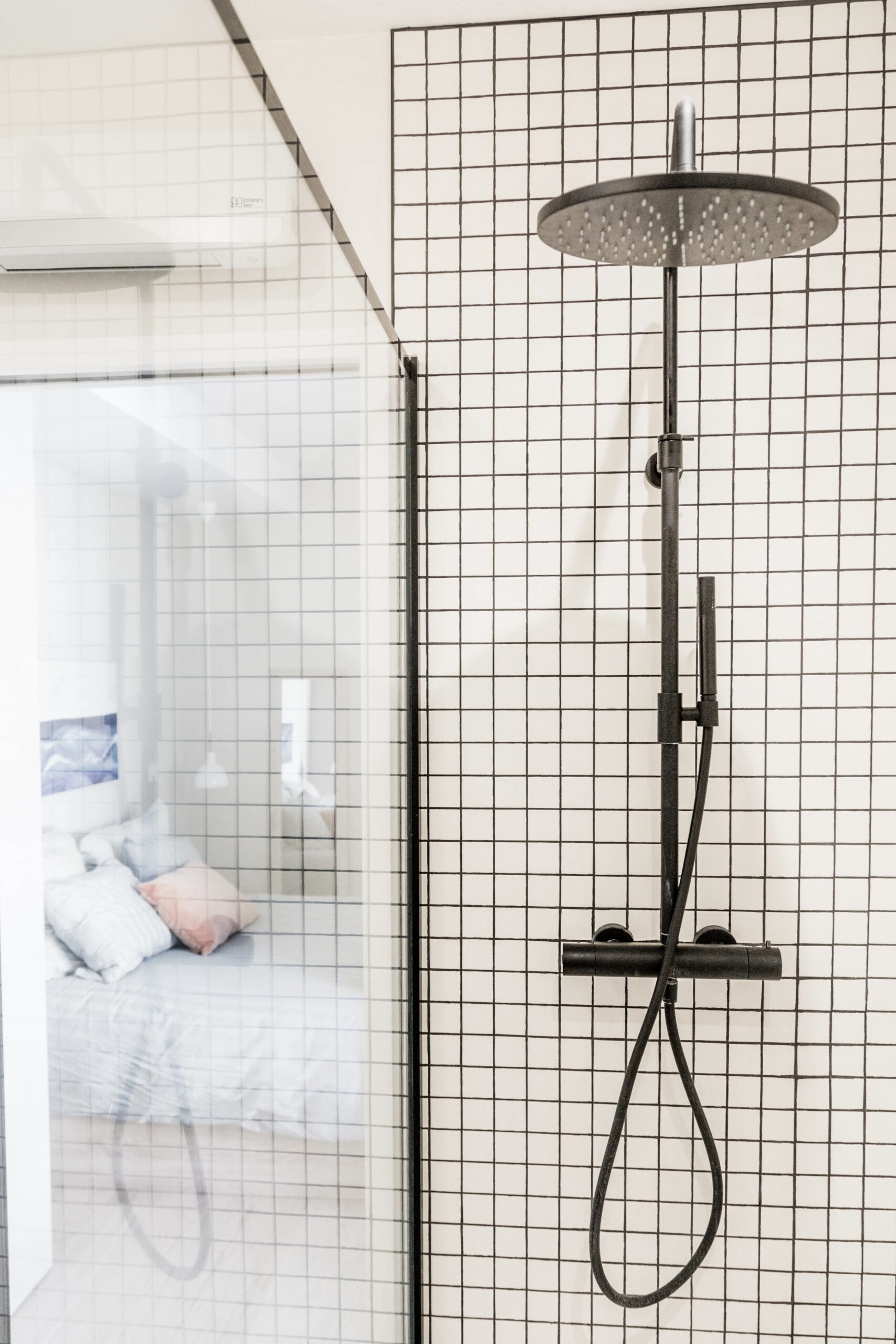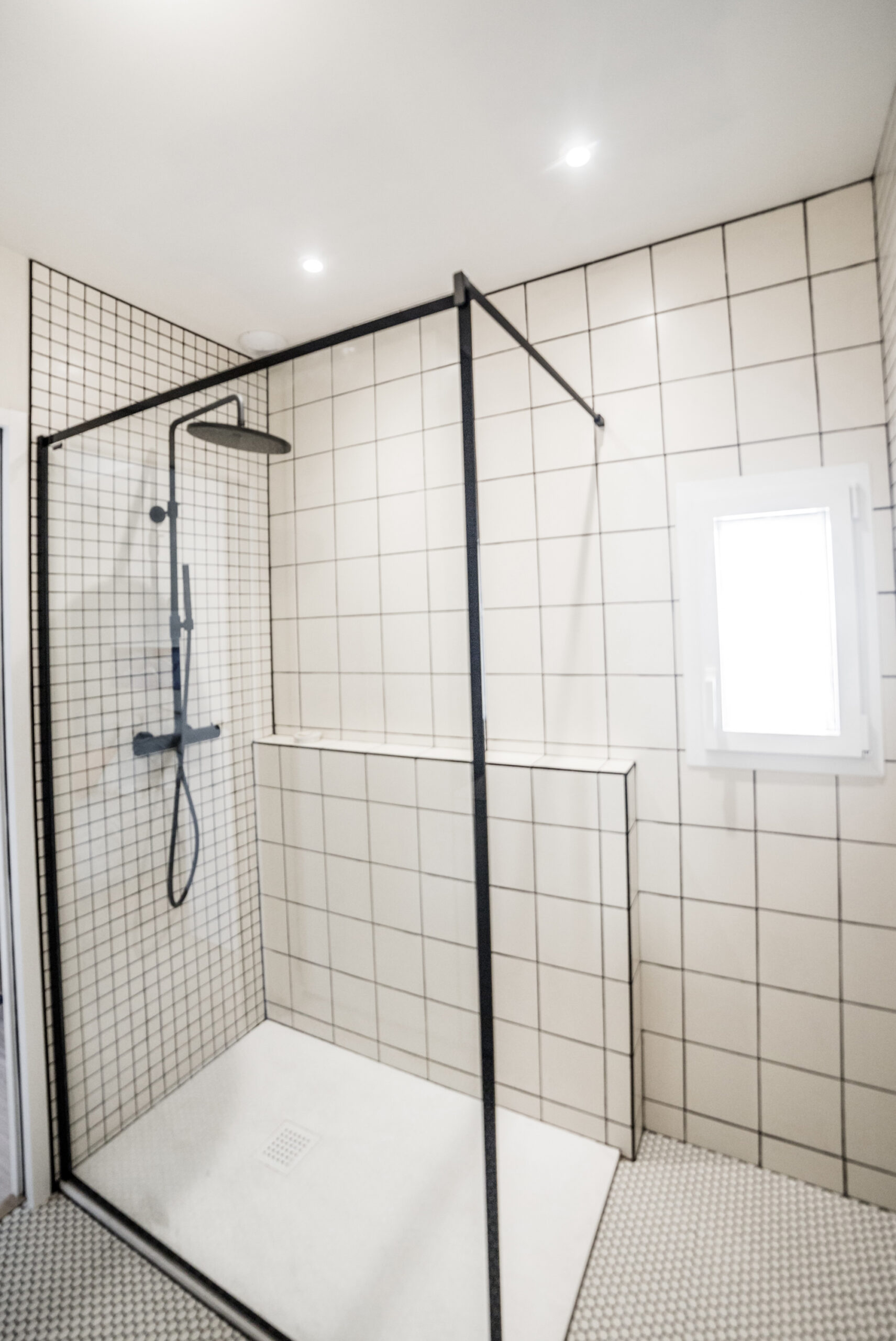 La salle de bains a été entièrement repensée pour devenir une salle d’eau contemporaine. Le carrelage mural blanc à joints noirs, la robinetterie noir mat et la paroi de douche à structure métallique créent une atmosphère graphique et chic. Au sol, une mosaïque de pastilles blanches apporte de la douceur et se marie parfaitement avec le parquet de la chambre attenante, visible à travers la porte vitrée.