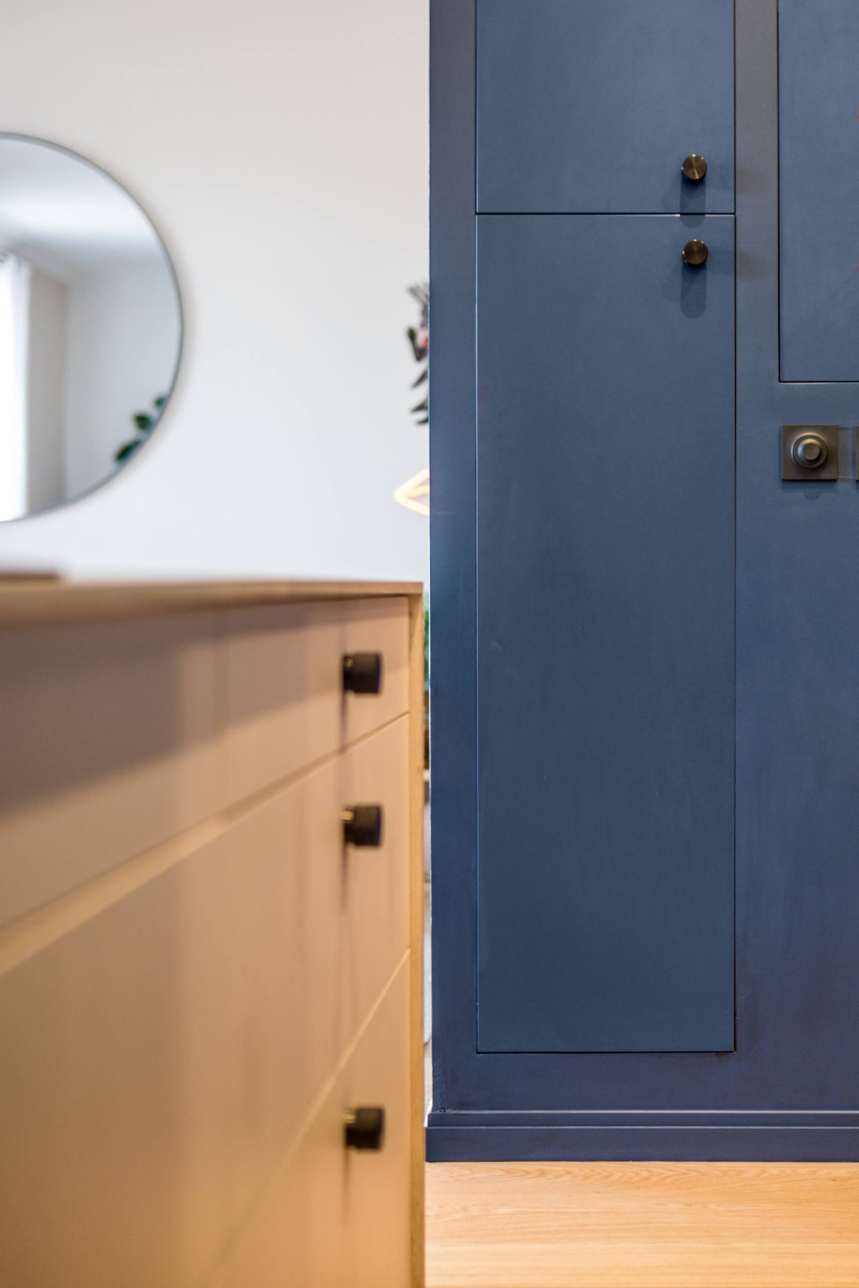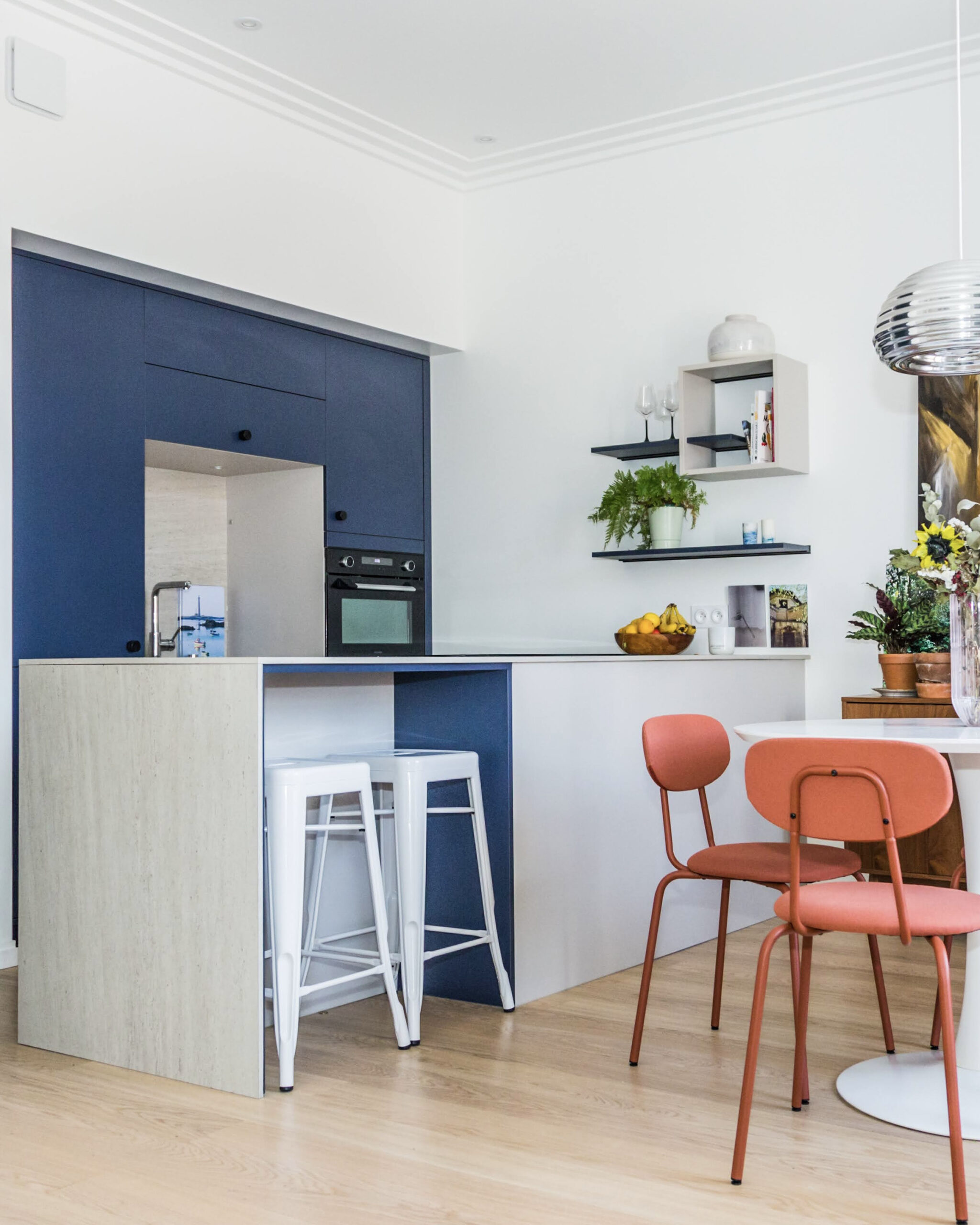 Le bleu profond des façades de cuisine apporte du caractère, tandis que l’îlot clair équilibre l’ensemble avec douceur.