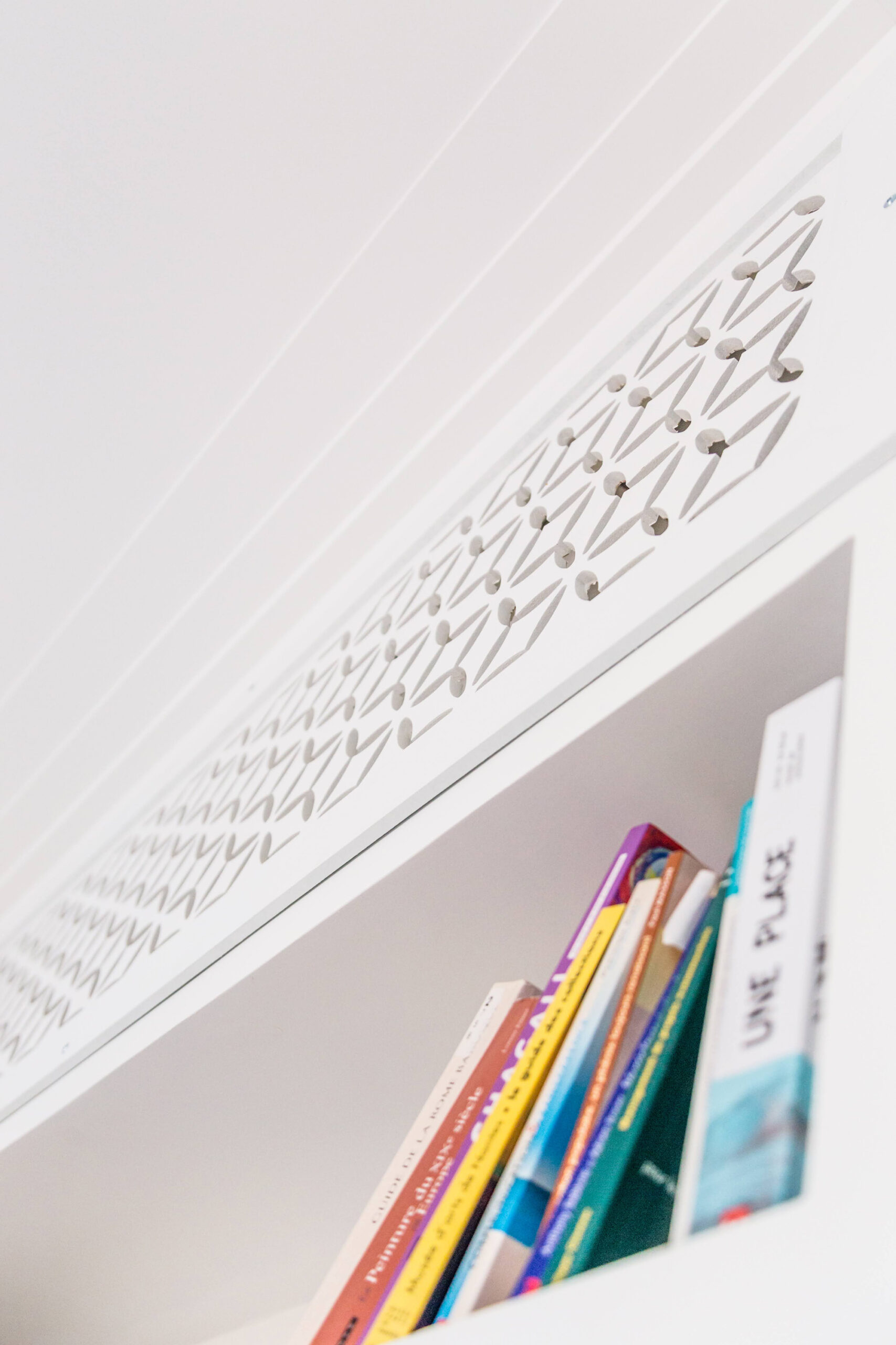 Conscients de l’importance du rangement dans un appartement de cette surface, LMAID a intégré des solutions sur mesure dans chacune des pièces. Une bibliothèque encastrée en lieu et place de l’ancienne entrée, des placards optimisés et des coffres utilisant l’espace perdu sous l’estrade de la chambre.