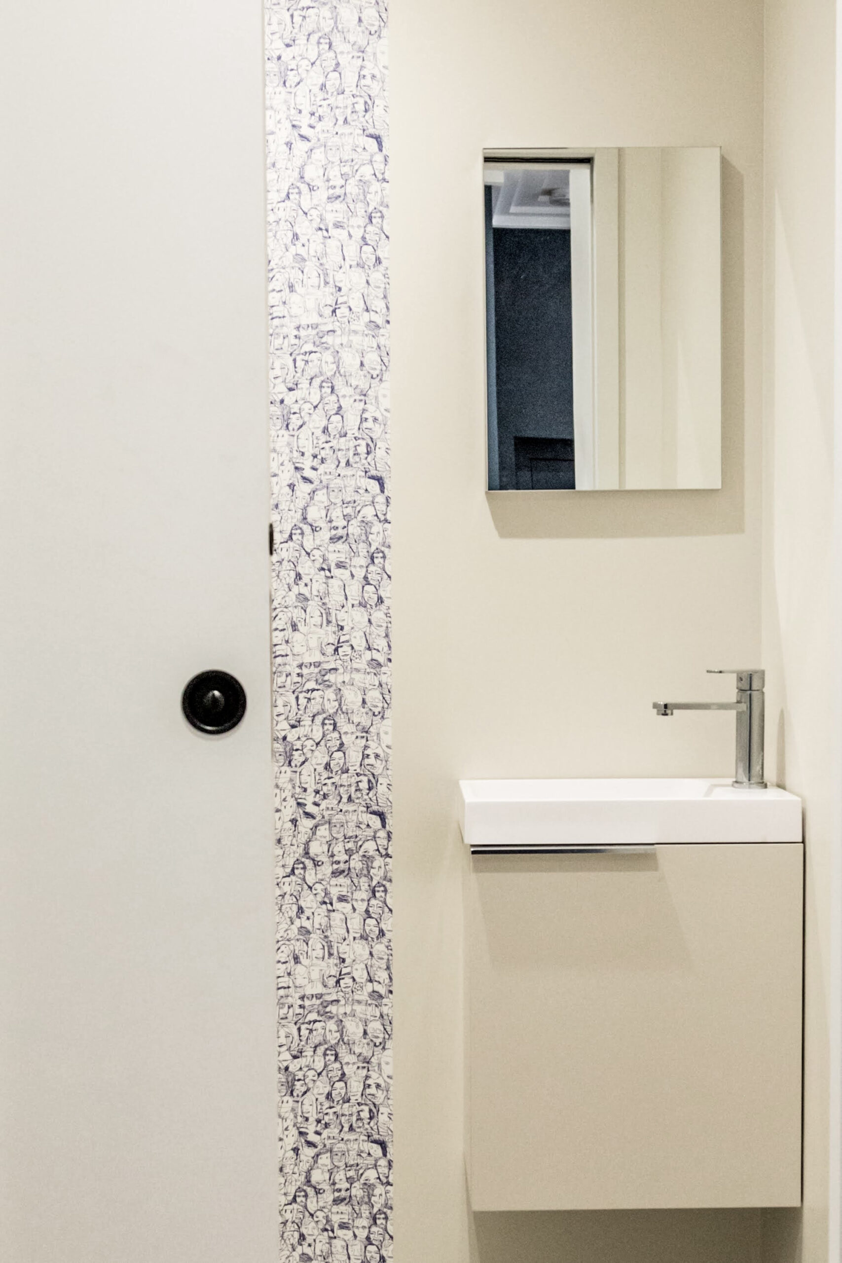 Dans les toilettes, un lé de papier peint aux motifs de visages dessinés apporte une touche d’originalité et de personnalité à ce petit espace.