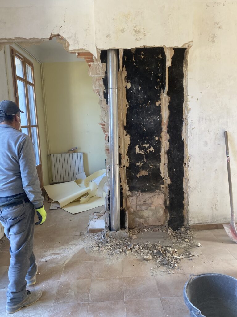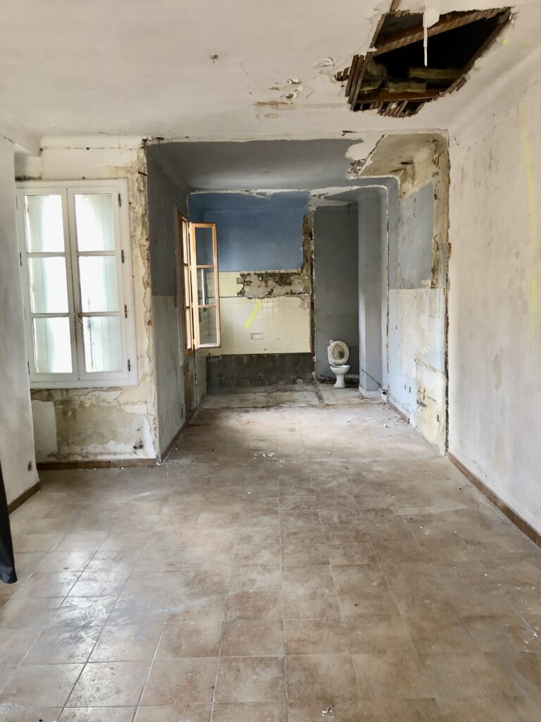 L’appartement a été entièrement curé. Cloisons déposées, cheminée supprimée, réseaux repris.